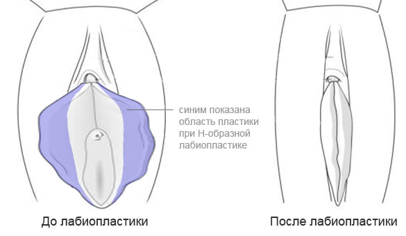 Лабиопластика: H - образная пластика малых половых губ, увеличение больших половых губ.