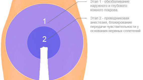 Сначала осуществляется обезболивание наружного кожного покрова, затем проводниковая анестезия, которая исключает любые болевые ощущения.